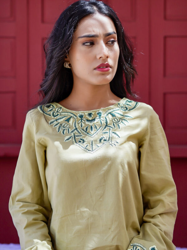 Straight Shirt with Round Neckline, Embroidered Neckline for an Elegant and Stylish Look.
