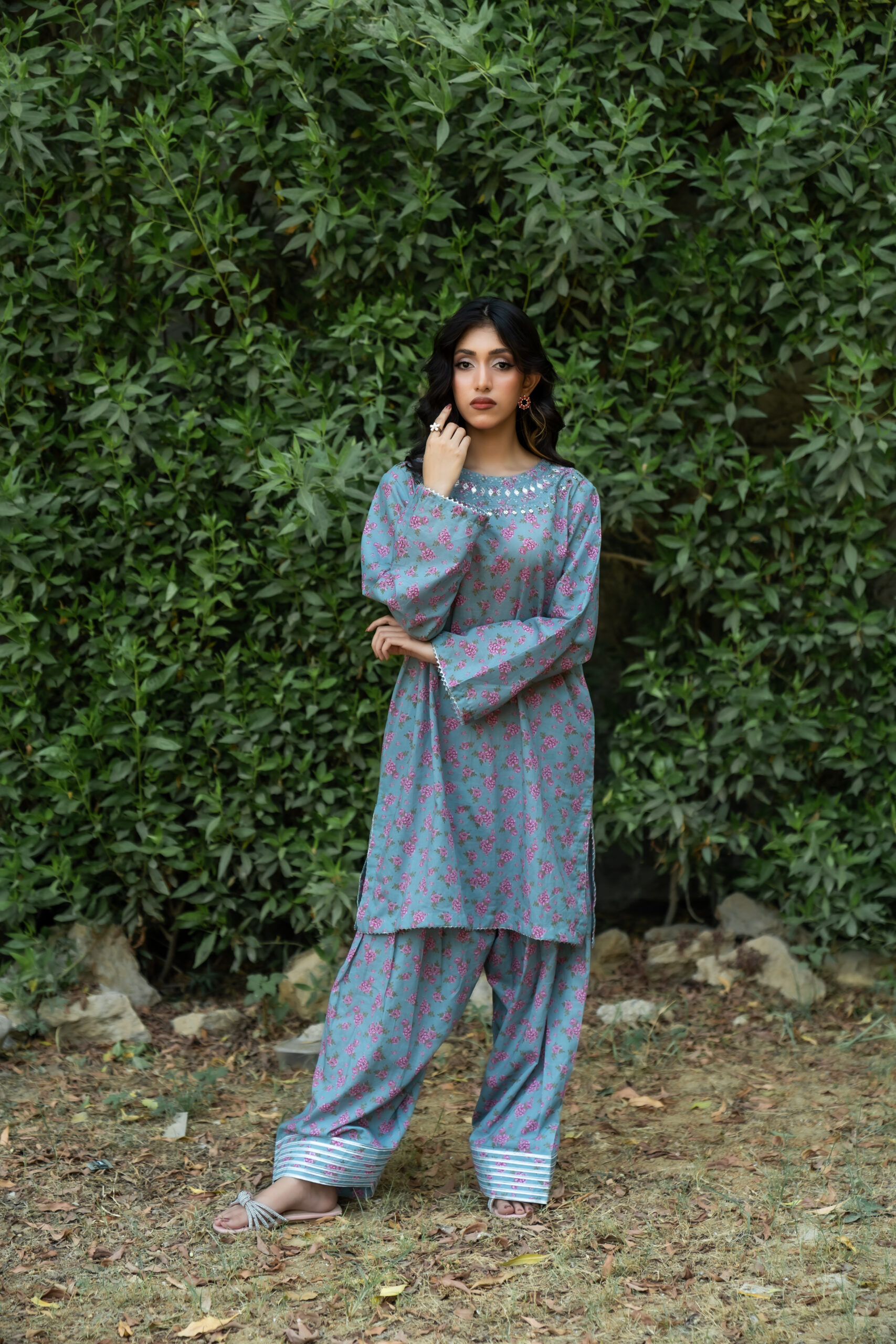 Step into effortless elegance with this soft grey lawn ensemble, adorned with a charming all-over pink floral print. The neckline is delicately highlighted with mirror work and subtle embroidery, adding a hint of sparkle without overpowering the look. Paired with a matching shalwar featuring striped detailing at the hem, this outfit blends everyday comfort with understated sophistication — perfect for casual gatherings or relaxed day wear.