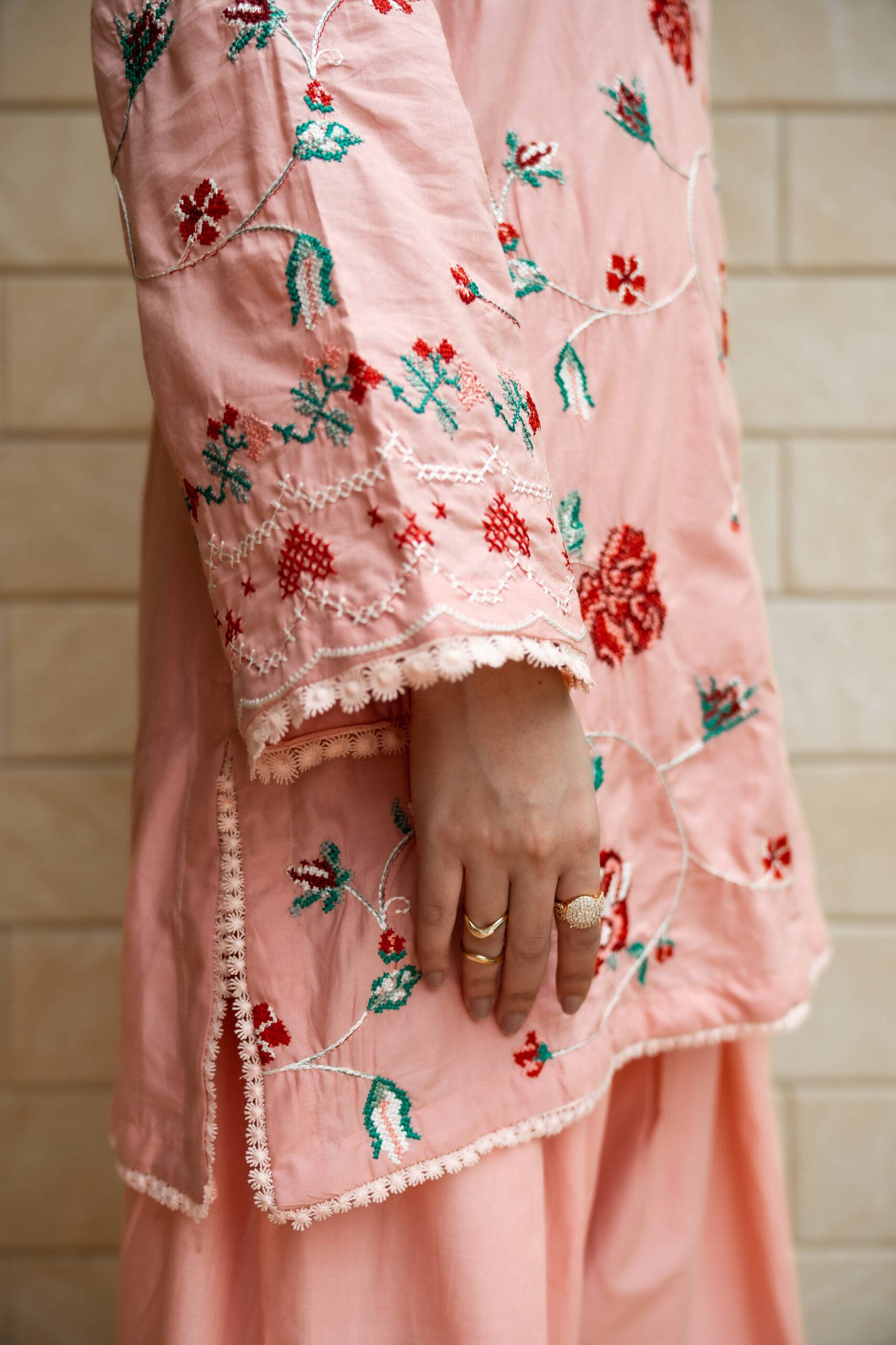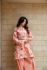“A rosy whisper of elegance.”A gentle rose-powder pink summer lawn, adorned with intricate floral embroidery and paired with a shalwar featuring delicately worked borders, radiates a perfect balance of softness and lively charm.