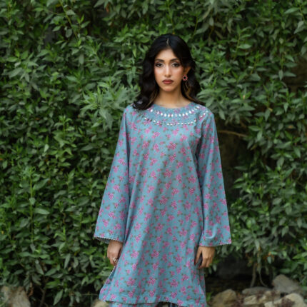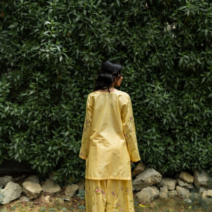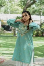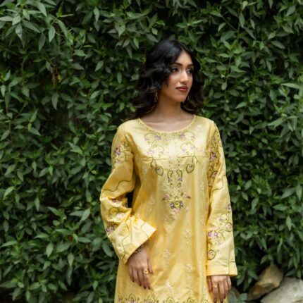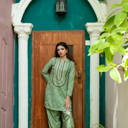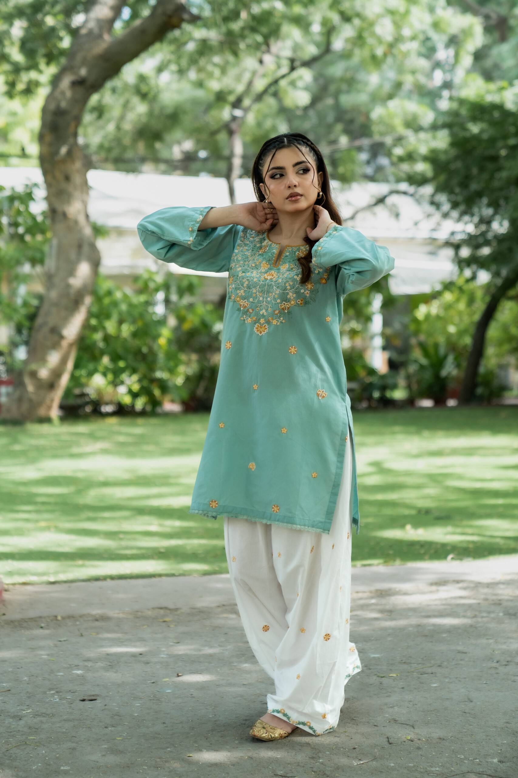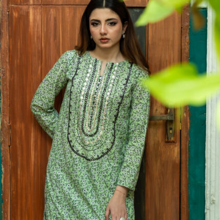 “Sea breeze hues meet timeless elegance”. A serene sea-green lawn with vibrant yellow accents, enhanced by composed embroidery and a statement neckline, paired with an elegantly embroidered white shalwar for a polished, refined look.